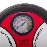 Lightweight and portable 12V car air compressor with pressure up to 260 PSI (18 bar) for quick tire inflation for cars, motorcycles, and bicycles, as well as inflating balls and air mattresses. It features an integrated pressure gauge, a convenient switch, and a set of adapters for universal use.