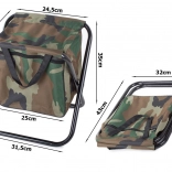 A lightweight, portable folding stool with a camouflage pattern, ideal for fishing, camping, the beach, and the garden. It offers comfortable, stable seating, a durable metal frame, and a practical zippered bag under the seat for storing your gear. Thanks to its compact folded dimensions, you can easily slip it into a backpack or carry it by the handles.