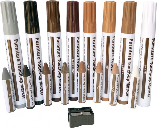 This practical set combines semi-hard wax crayons for filling grooves and dents and colored markers for retouching wood grain. Thanks to the rich palette of shades, you can easily match colors with surfaces such as oak, walnut, cherry, mahogany, maple, and neutral tones.