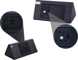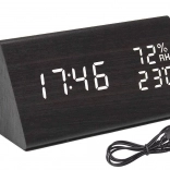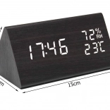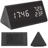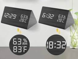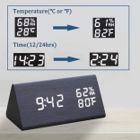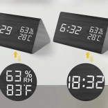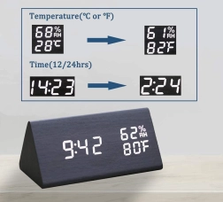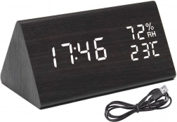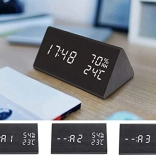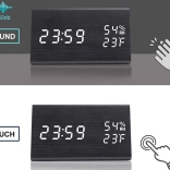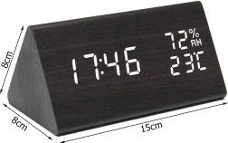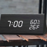 Designer desktop clock with a black wood effect fits perfectly in the bedroom, living room, or office. The multifunction display shows the time, date, temperature (°C/°F), and humidity. Thanks to sound control, the display lights up in power-saving mode with a clap or tap, which is ideal especially at night.