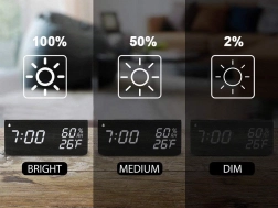 Set three independent alarms and choose the display brightness in three steps: 100%, 50%, or 2% for day and night.