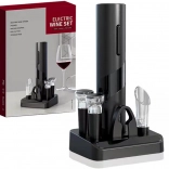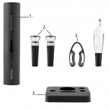 - Electric corkscrew, foil cutter, pourer, 2× vacuum stopper, bottle holder, coaster, original packaging