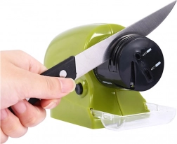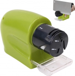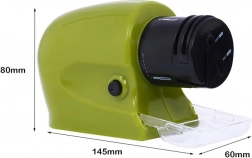 Practical electric sharpener for knives, scissors, and flat screwdrivers that delivers sharp edges in just a few seconds. Thanks to the rotating, removable head, safe operation with a covered grinding area, and 4× AA power, it's ideal for any kitchen or workshop. Compact dimensions 145 × 60 × 80 mm and the shavings collector make use and maintenance easy.