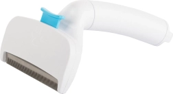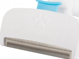 A practical de-shedding comb for dogs and cats that quickly removes undercoat and loose hair without damaging the topcoat. Thanks to stainless steel metal teeth and an ergonomic handle, grooming is easy and comfortable. With the press of a single button, you can clean the comb head effortlessly. Ideal for regular care and fewer hairs at home – up to 90% less shedding, healthy, shiny coat, quick cleaning, and a durable build.