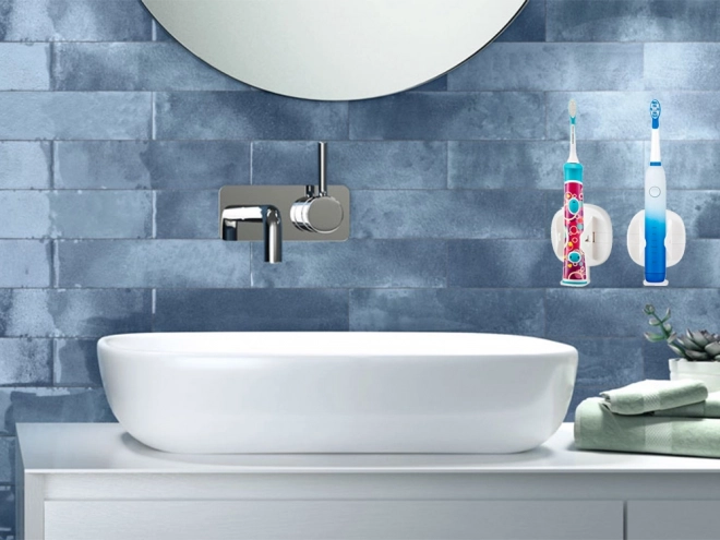 This wall-mounted electric toothbrush holder saves space in your bathroom. Easy installation using transparent adhesive.