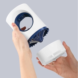 The removable collection container allows for quick and hygienic cleaning without direct contact with insects. USB power gives placement flexibility—use a power bank, adapter, or USB port. The elegant design in white and dark blue fits any interior.