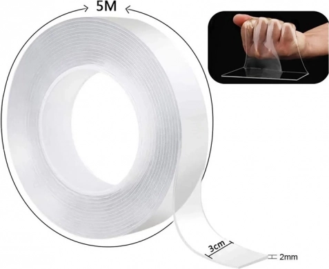 The double-sided transparent tape is very easy to apply. Simply clean the surface where it is to be applied, and press the tape down. It can be easily removed and reused after washing, without leaving traces. Use it to hang pictures, various kitchen utensils, and for securing cables, moldings, or carpets.