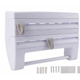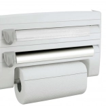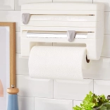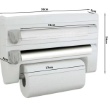 Bring order to your kitchen with a practical 4-in-1 wall-mounted organizer that holds aluminum foil, cling film, and paper towels, plus a top shelf for spices and small items. Thanks to precise concealed blades, you can tear films quickly and without jagged edges. Installation is easy and it suits standard rolls up to 31/27 cm.