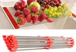 L'égouttoir est compact et pliable, ce qui permet un rangement facile. Il est facile à nettoyer et résiste à des températures allant jusqu'à 200 °C, vous pouvez donc l'utiliser comme surface pour des plats chauds ou lors de la cuisson en toute sécurité. Les tubes télescopiques augmentent l'espace selon les besoins.