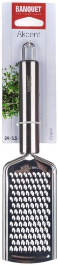 Pratique et résistante, la râpe en acier inoxydable 24 cm Akcent convient à un usage professionnel comme domestique. Elle offre une entretien facile, la possibilité de lavage au lave-vaisselle et un œillet de suspension pour un rangement gain de place.