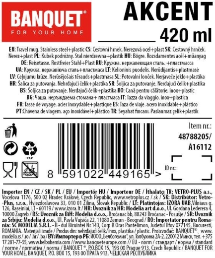 Mug de voyage AKCENT à double paroi, adapté aux boissons froides et chaudes. Partie extérieure en acier inoxydable 201 combinée avec un revêtement en silicone noir et partie intérieure en acier inoxydable 304. Volume utile 420 ml.
