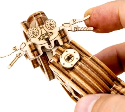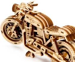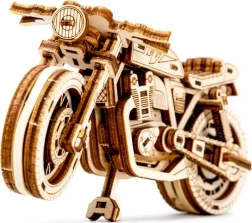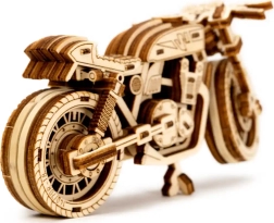 Construisez une élégante moto Café Racer en contreplaqué naturel et profitez de sa mécanique fonctionnelle. Grâce à la marche arrière et au moteur à élastique, le modèle parcourt jusqu’à 1 mètre, dispose de roues caoutchoutées, d’un mécanisme à volant d’inertie et de commandes réalistes. Le montage se fait sans colle ni outils et l’emballage sert de support.