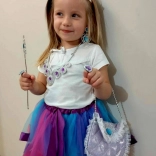 Ce set magique de 9 pièces transforme chaque enfant en véritable princesse en un instant. La jupe tutu multicolore dans des nuances de rose, violet et bleu se distingue par ses couches de tulle aériennes et sa taille confortable. L’élégante tiare avec pierres roses, le collier scintillant et les boucles d’oreilles soulignent l’allure festive, tandis que la baguette magique et le ravissant sac à main complètent la tenue.