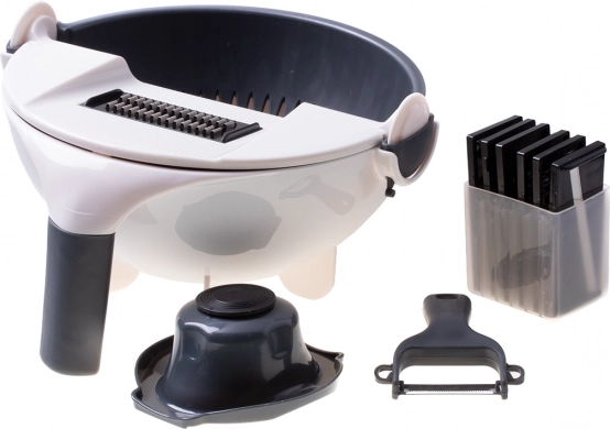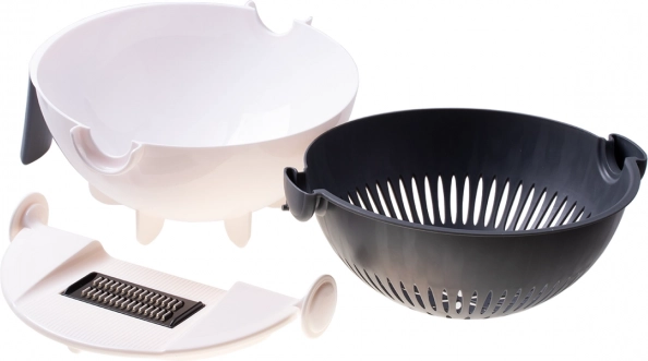 La passoire rotative simplifie le travail en permettant un drainage immédiat de l'eau excédentaire après la découpe. Elle peut également être utilisée pour égoutter les pâtes ou la salade. La râpe est équipée d'une poignée avec des piques qui protègent les doigts des coupures.