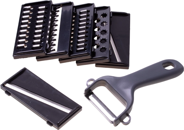 Grâce à cet ensemble, préparez facilement des frites, une salade de concombre, du fromage râpé ou des pommes pour une tarte. La râpe peut être placée confortablement sur le bol et l'accessoire approprié peut être choisi de sorte que les produits râpés ou tranchés tombent directement dans le bol.