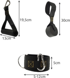 - 5 bandes de résistance, 2 poignées, 2 sangles de cheville, 1 ancre de porte, sac de transport