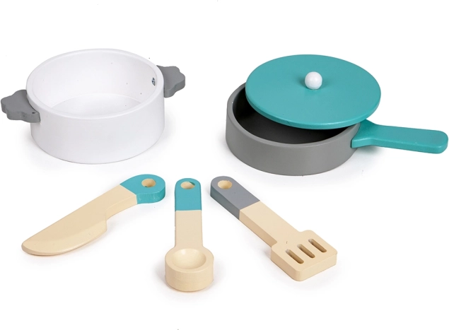 Inclut une « machine à laver » pour le jeu de la maison et cinq accessoires en bois : tasse, poêle avec couvercle, cuillère, spatule et couteau. Le tout en bois verni en toute sécurité.