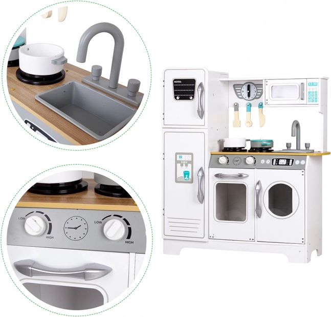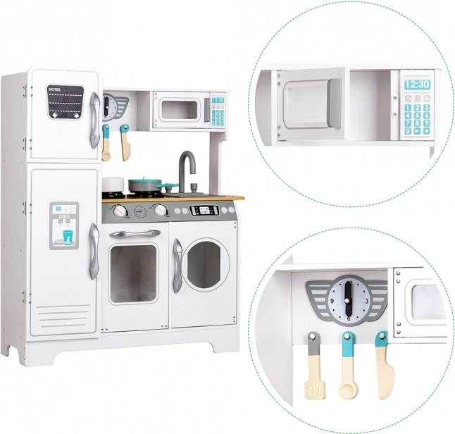 La cuisine est conçue avec un souci de sécurité et de détail. La structure en bois garantit stabilité, bords lisses et peintures sûres pour les enfants. Des crochets intégrés gardent les ustensiles de cuisine toujours à portée de main, et les étagères du réfrigérateur et du placard offrent suffisamment de place pour tous les accessoires.