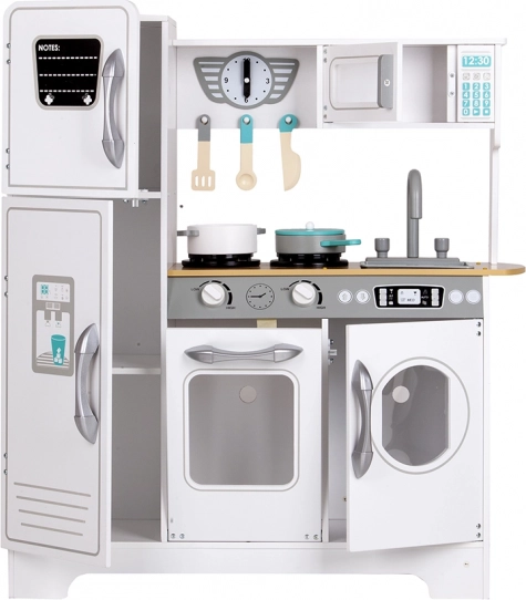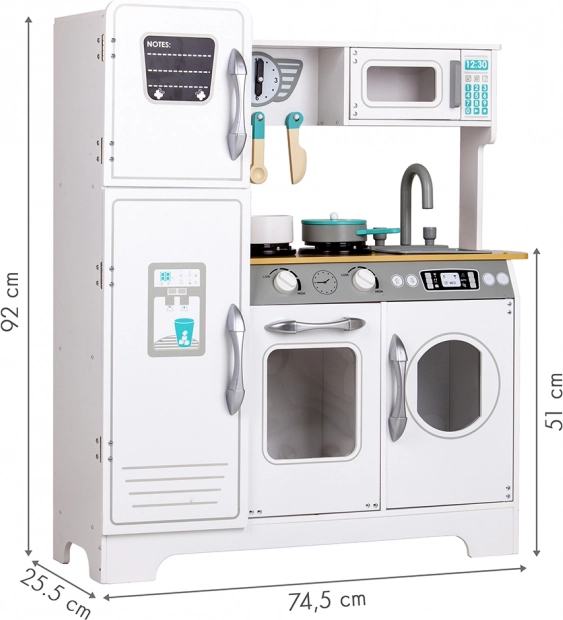 Cuisine pour enfants élégante en bois massif pour de petits chefs dès 3 ans. Elle offre des boutons de commande réalistes avec clic, un réfrigérateur ouvrant, un four et un micro-ondes, un évier spacieux et même une « machine à laver » pour le jeu de la maison. Inclus, 5 accessoires de cuisine en bois pour des heures de jeu créatif et le développement de l’imagination et de la motricité fine.