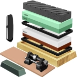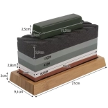 - 4 pierres à aiguiser (400/1000/3000/8000), 2 tapis en caoutchouc, base en bambou antidérapante, sangle en cuir et support pour polissage, pâte à polir, guide pour ciseaux à bois/couteaux, guide de tranchant, pierre de dressage, boîte colorée, carton de transport