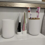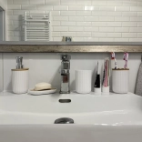 Des détails bien pensés tels que l’insert en bambou du porte-savon pour un égouttage rapide, la pompe chromée du distributeur, ou encore les ouvertures séparatrices dans le couvercle en bambou du gobelet à brosses à dents améliorent le confort et l’hygiène au quotidien. La poubelle à large ouverture circulaire maintient le sac en place et reste élégante.