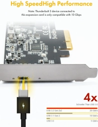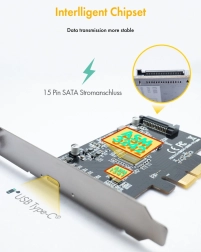 Grâce à la prise en charge du PCI Express 3.0 (x4) et à la compatibilité avec les slots x4/x8/x16, elle assure une connexion stable et rapide. Des LED bleues intégrées indiquent l’alimentation et la connexion active, vous offrant une visibilité permanente sur l’état du dispositif. La carte s’appuie sur les contrôleurs éprouvés Asmedia ASM1541 et ASM3242 pour une compatibilité et des performances maximales.