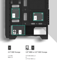 - Stockage : jusqu’à 2× HDD 3,5" et 2× SSD 2,5"