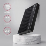 L'utilisation d'un boîtier en aluminium nervuré contribue à un refroidissement efficace et à la protection du disque, tandis que les pieds en caoutchouc assurent une stabilité sur la surface. Le design élégant prévient également les empreintes digitales indésirables.