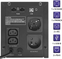 La technologie AVR (Automatic Voltage Regulation) compense les fluctuations de tension et préserve la batterie, tandis que la fonction Cold Start permet d’allumer les appareils connectés même en l’absence du secteur. S’ajoutent une protection contre les surcharges et les courts-circuits et un port USB pour la connexion au PC avec logiciel de surveillance et de gestion de l’UPS.