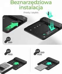 Installation simple: Le design à insertion facile sans outils permet d’insérer des disques 2,5"/3,5" ou des SSD M.2 directement dans l’emplacement.
