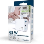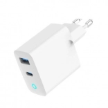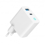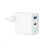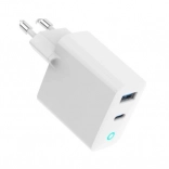 Chargeur secteur compact avec technologie GaN offrant une puissance de 65 W pour la charge rapide de votre téléphone, tablette et ordinateur portable. Grâce au duo de ports USB‑C et USB‑A, il prend en charge Power Delivery (PD) et Quick Charge 3.0, tandis qu’un indicateur LED pratique affiche l’état de l’alimentation.