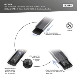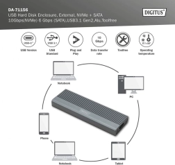 Étendez votre stockage en un instant avec un boîtier compact et robuste en aluminium (Pantone 430C). Il offre des transferts haut débit jusqu’à 10 Gb/s (NVMe) et 6 Gb/s (SATA), est entièrement plug and play et s’alimente directement via USB. La conception sans outil permet un remplacement rapide des disques.