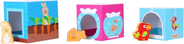 Six adorables petits animaux en bois s’insèrent dans les ouvertures correspondantes des cubes. Les enfants s’exercent au tri, à l’association et au jeu imaginatif.