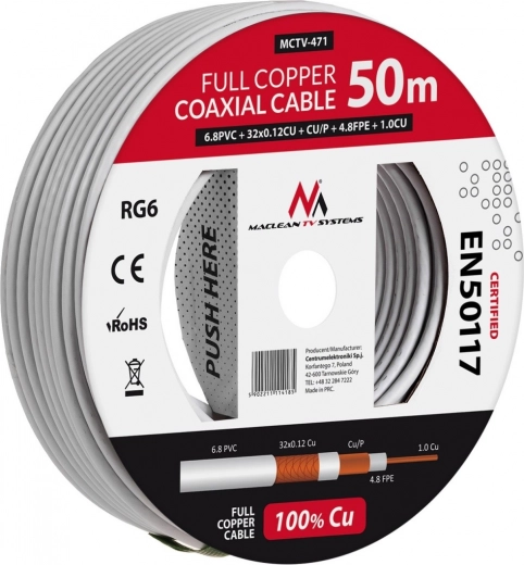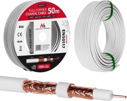 Câble coaxial RG6 de haute qualité en cuivre massif d’une longueur de 50 mètres, garantissant une excellente transmission du signal sans interférences, même sur de longues installations.