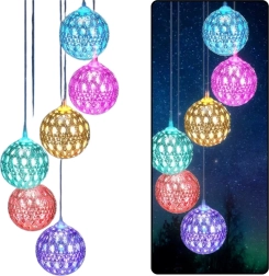Cette lampe se compose de six boules ajourées suspendues à de fins câbles, qui diffusent une lueur douce et réfléchissent la lumière des LED RGB intégrées. Grâce à l’alimentation solaire, aucun câble ni pile n’est nécessaire – une solution écologique et pratique. Un capteur crépusculaire intégré allume automatiquement la lumière dès la tombée de la nuit.