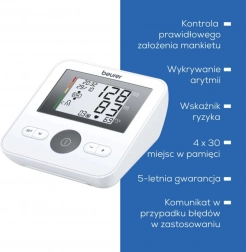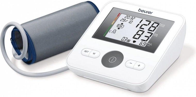 Tensiomètre bras BEURER BM 27 fiable pour la mesure à domicile de la tension artérielle et du pouls, offrant mesure automatique, détection des arythmies, indicateur de risque coloré selon l’OMS et contrôle de la bonne mise en place du brassard. Brassard universel pour tour de bras 22–42 cm, écran lisible et mémoire pour 4 utilisateurs (30 mesures chacun) pour faciliter le suivi à long terme des valeurs.