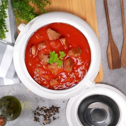 La thermobol élégante ORION Deluxe est une aide précieuse pour les repas du quotidien comme pour les fêtes du week‑end. Elle maintient la température des plats, soupes ou accompagnements jusqu’à deux heures et, en été, conserve également glaces et desserts au frais. La surface interne lisse en acier inoxydable est facile à nettoyer et hygiénique.