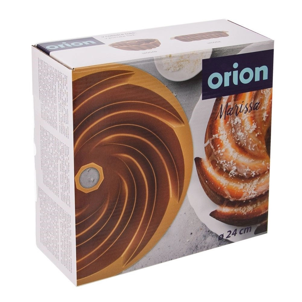 Élégant moule à kouglof ORION Marissa de 24 cm de diamètre avec cheminée centrale assurant une cuisson uniforme, un revêtement antiadhésif PFLUON pour un démoulage facile et un motif spiralé décoratif pour un service élégant.