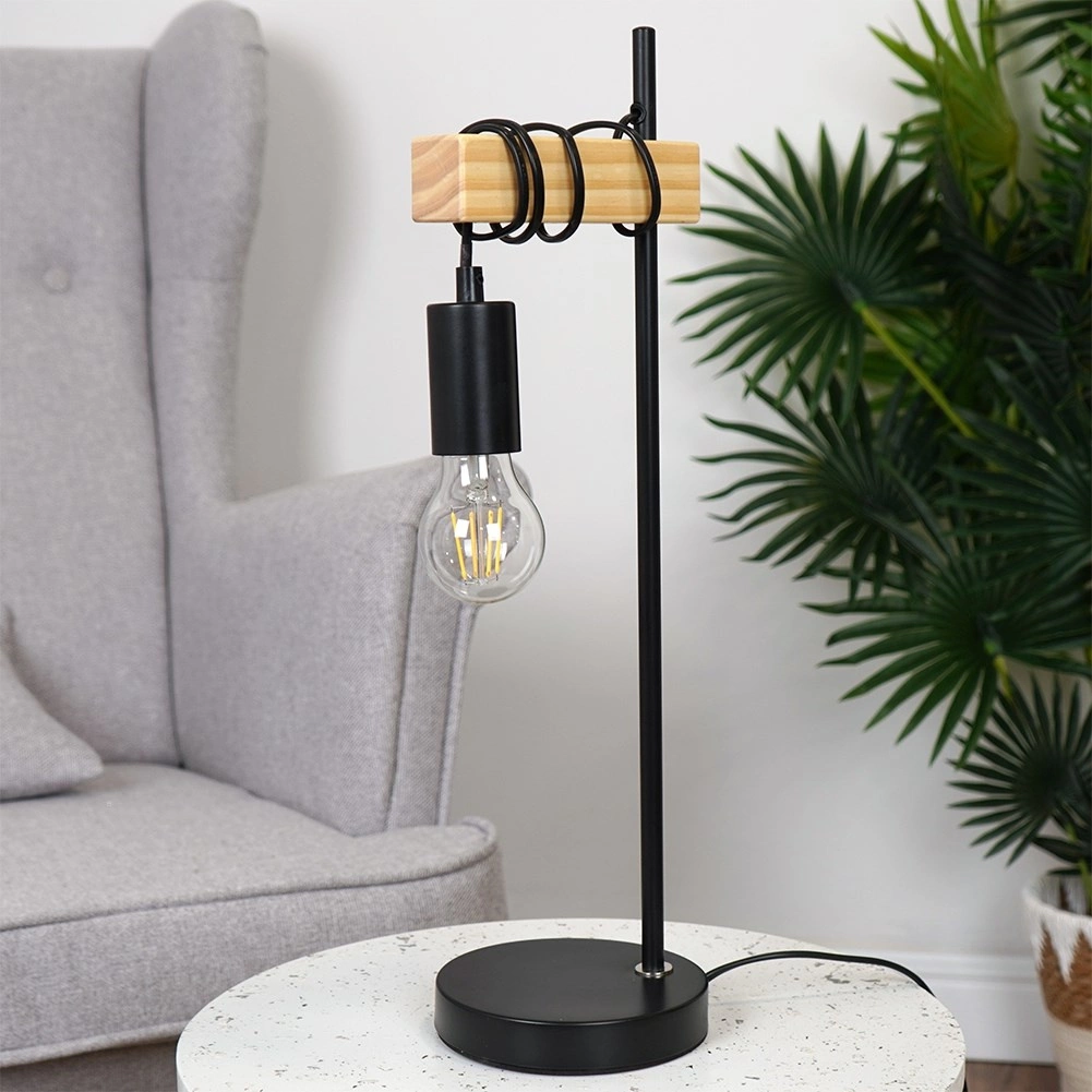 Lampe de table élégante combinant métal et bois offrant un design industriel LOFT, une construction stable et un commande pratique sur le câble. Hauteur 51 cm, diamètre de la base 14 cm – idéale pour le bureau, la commode ou la table de chevet. Compatible avec les ampoules E27 (max. 25 W) pour une ambiance lumineuse chaleureuse.