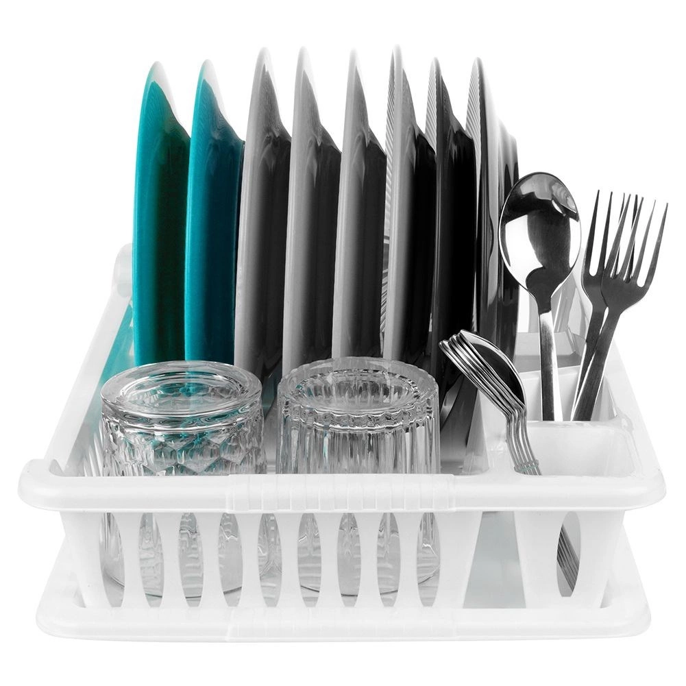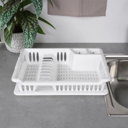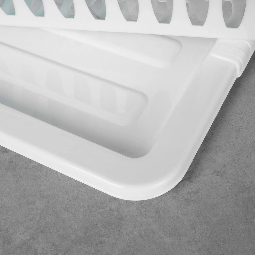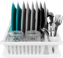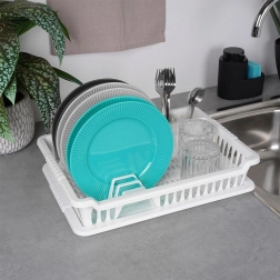 Pratique égouttoir à vaisselle blanc de dimensions 40 × 29 × 8,5 cm, qui facilite le séchage des assiettes, verres et couverts tout en protégeant le plan de travail de la cuisine. Il possède un plateau d'égouttage amovible, de la place pour 8 assiettes, des compartiments pour couverts et un espace pour tasses. Il est facile à nettoyer, sans BPA et, grâce à son design classique, s'intègre parfaitement aux cuisines modernes comme traditionnelles.