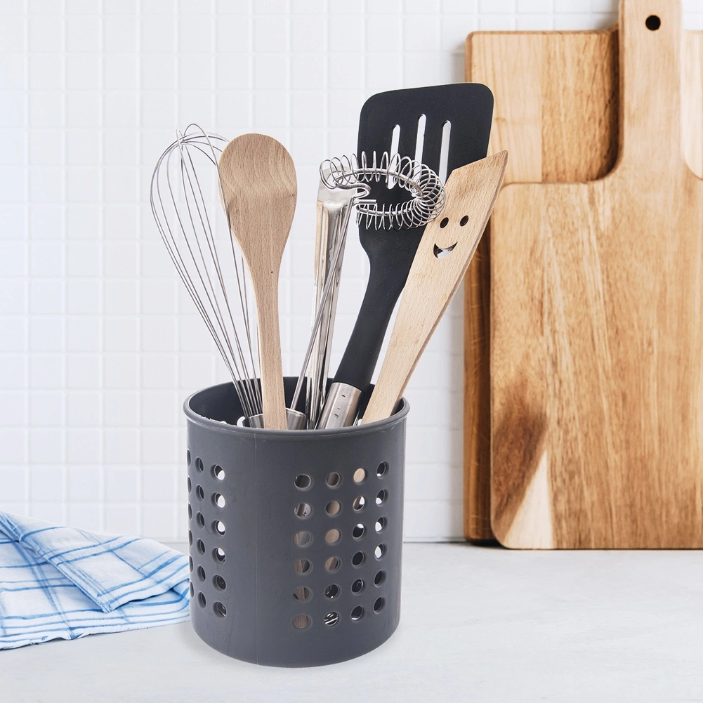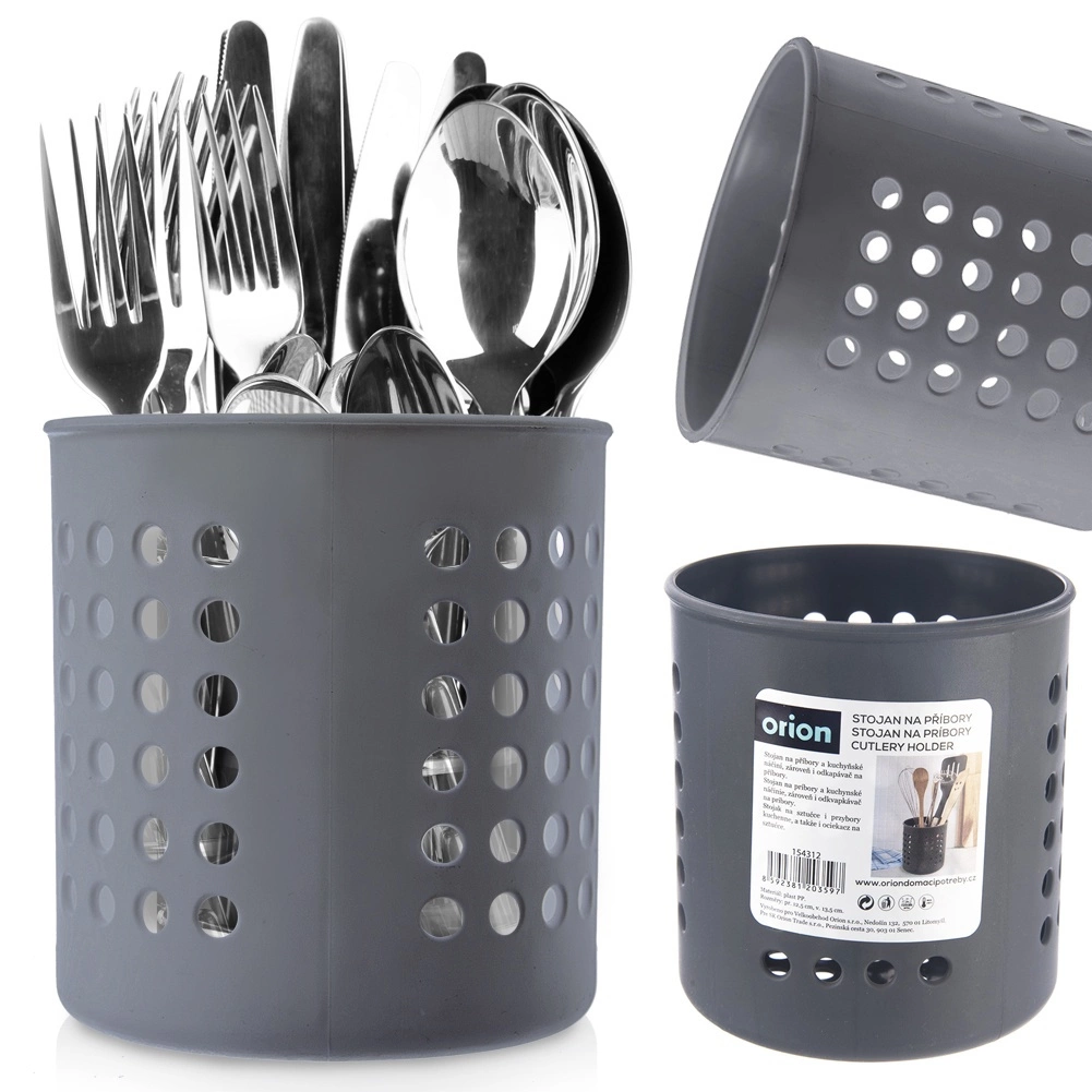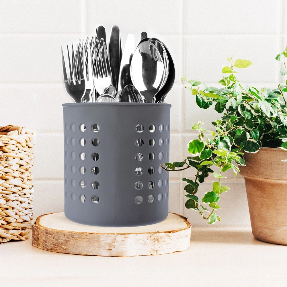 Égouttoir et organiseur gris pratique pour couverts et ustensiles de cuisine, avec parois perforées pour un drainage rapide et une circulation de l’air optimale. Fabriqué en plastique résistant, léger et facile à nettoyer, pour garder votre plan de travail en ordre avec tout à portée de main. Utilisation universelle, entretien facile et design moderne pour toute cuisine.