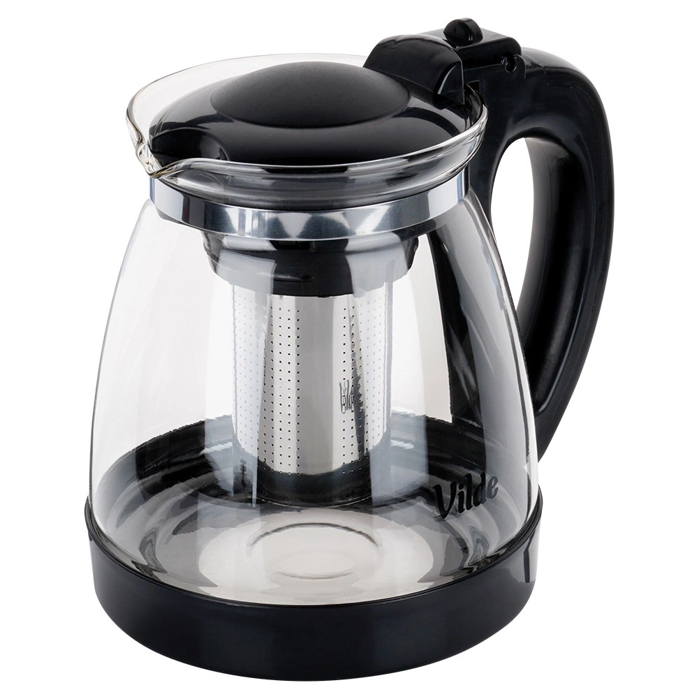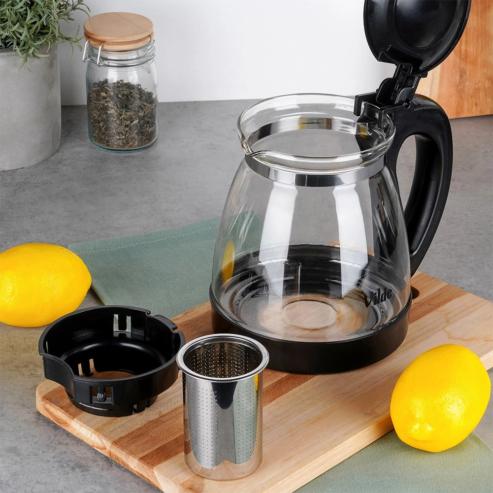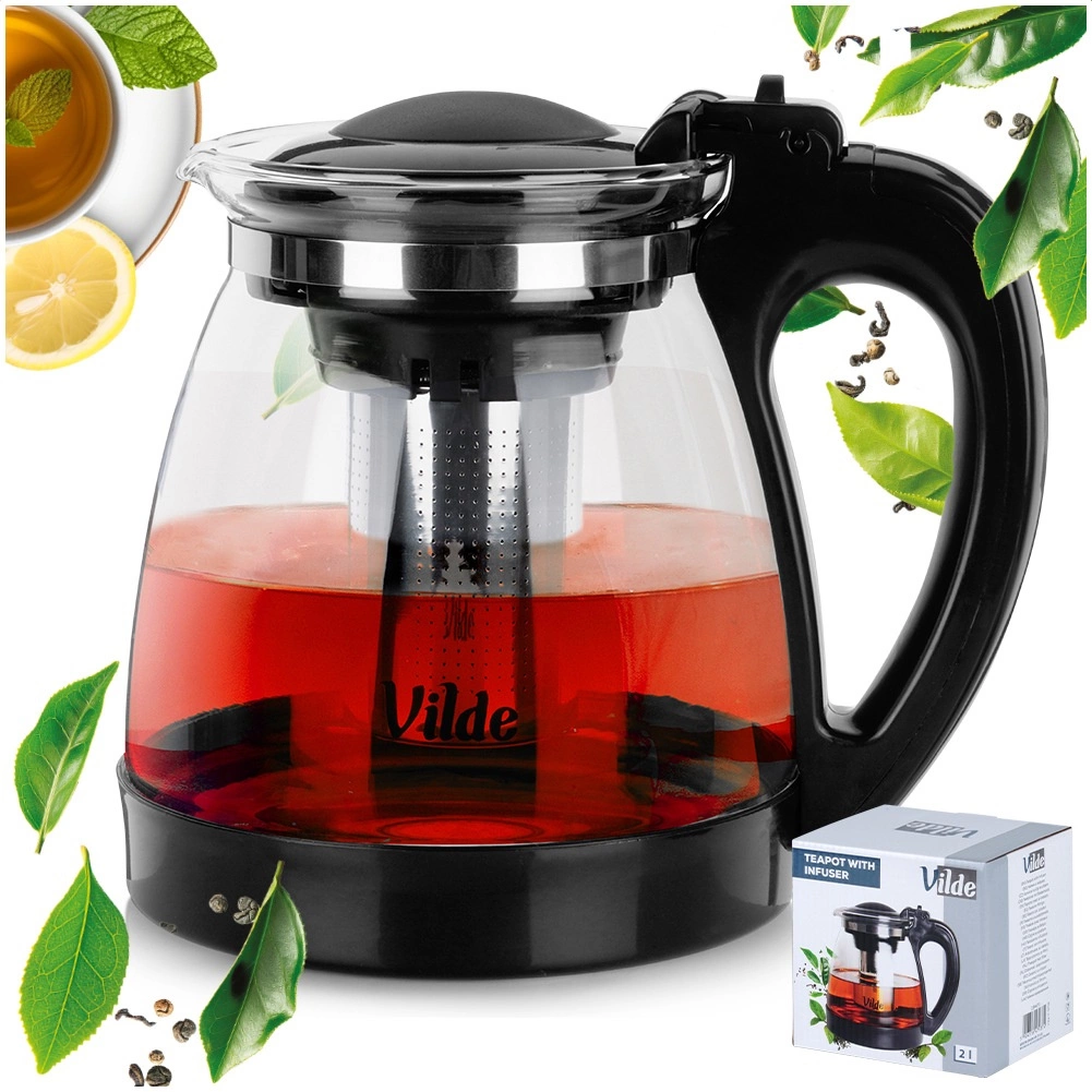 Élégante théière en verre de 2 l avec infuseur amovible en acier inoxydable pour thé en vrac et herbes. Fabriquée en verre borosilicaté résistant, avec une prise en main confortable, un couvercle basculant et un bec verseur précis. Idéale pour préparer un thé sans résidus, des boissons chaudes et froides et pour un service facile.