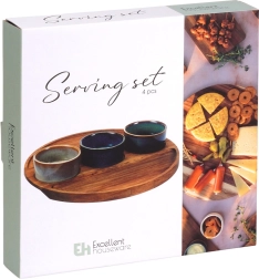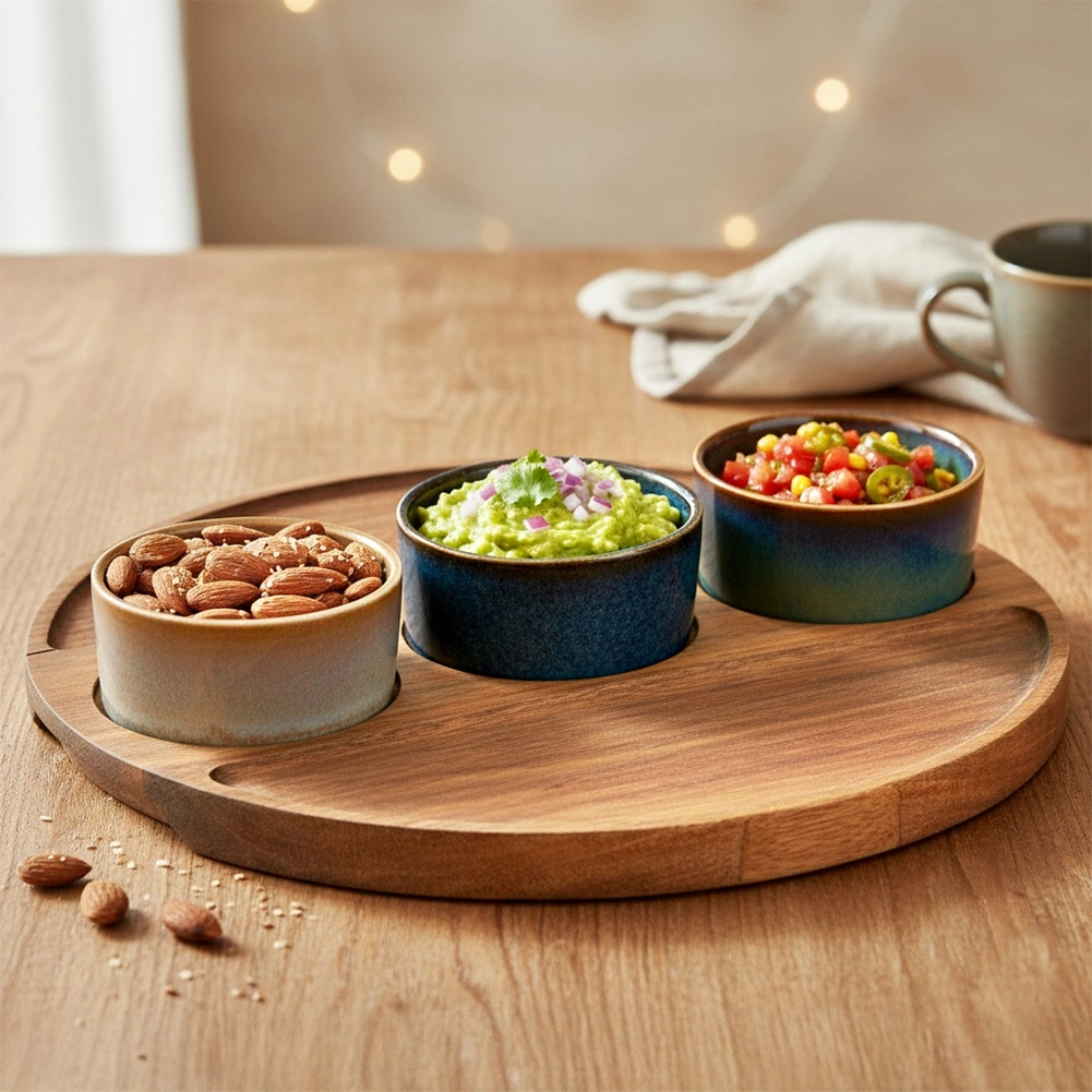 Élégant set de 4 pièces pour le service avec plateau en bois et trois petites coupelles en céramique, idéal pour olives, noix, dips et antipasti. Chaque coupelle possède une glaze unique, le plateau en bois d’acacia dispose de logements fraisés pour une parfaite stabilité. Dimensions du set 25 × 25 × 4,5 cm, coupelles 7 × 3 cm, capacité 65 ml. Les coupelles sont compatibles lave-vaisselle (sans le plateau).