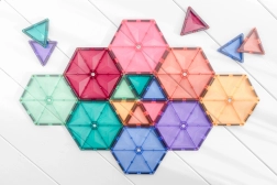 Contient des triangles et des hexagones pour créer des motifs 2D et des objets 3D. Idéal pour développer la symétrie, les relations spatiales et les motifs.