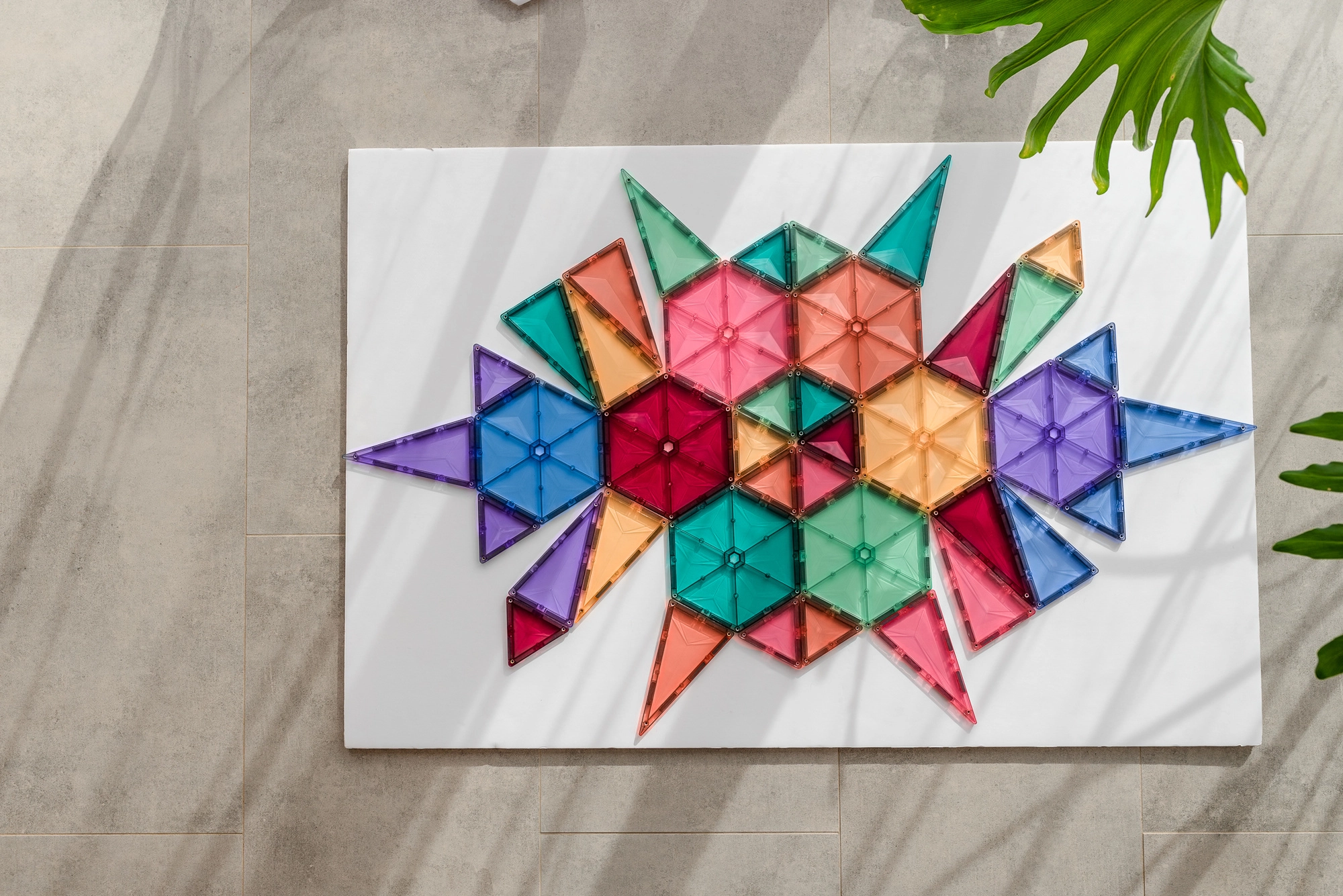 Des formes géométriques translucides aux teintes douces invitent à créer des motifs, explorer la lumière et les couleurs et découvrir la géométrie de manière ludique.