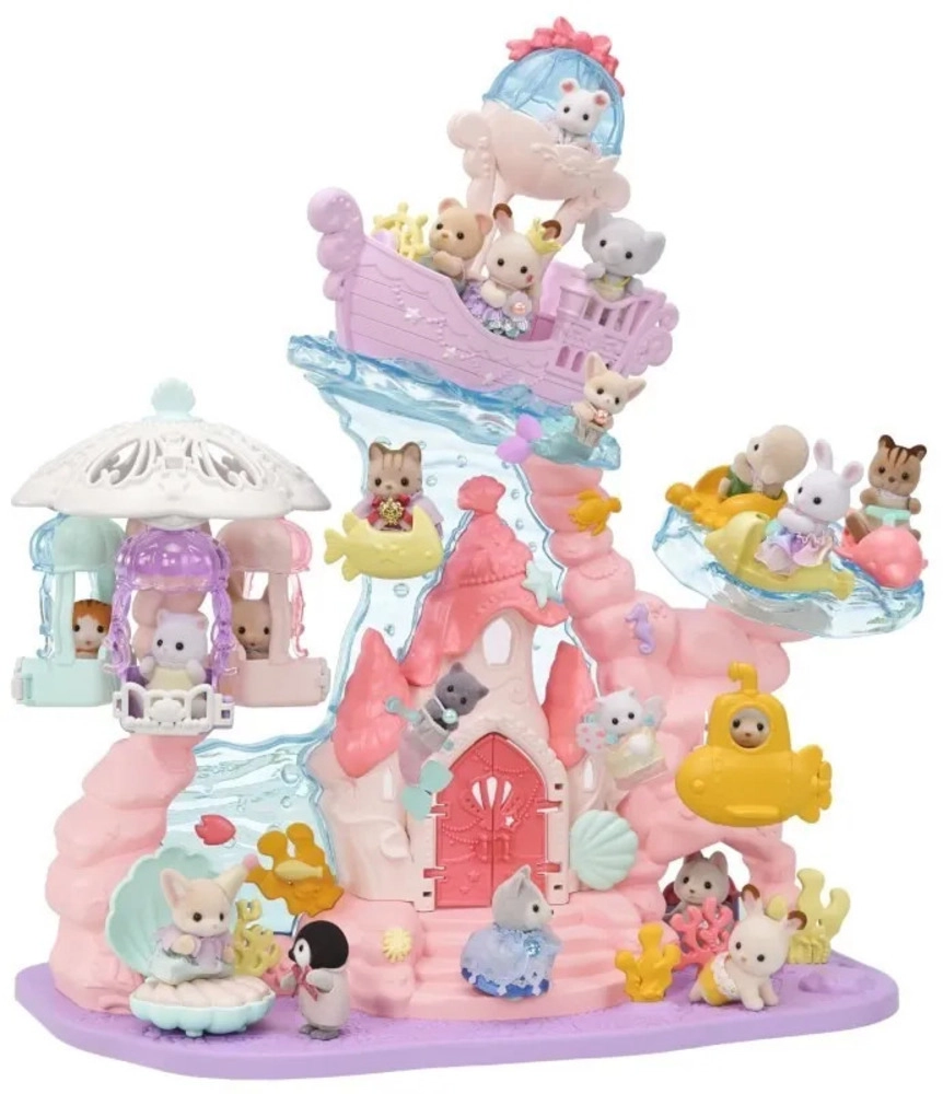 Découvrez le palais sous-marin SYLVANIAN FAMILIES, qui transforme la chambre des enfants en royaume de fantaisie. Le set propose une téléphérique qui monte et descend, un carrousel de créatures marines, des balades en sous-marin et sur un poisson jaune. Inclus, trois figurines enfant en velours avec articulations mobiles, un coffre au trésor, des portes ouvrantes et un lit en forme de coquillage – idéal pour le jeu créatif et le développement de la motricité fine dès 3 ans.