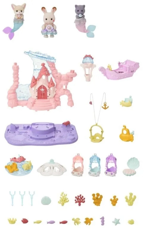 - palais, 3 figurines, téléphérique, carrousel, sous-marin, poisson jaune, coffre au trésor, portes ouvrantes, lit en forme de coquillage