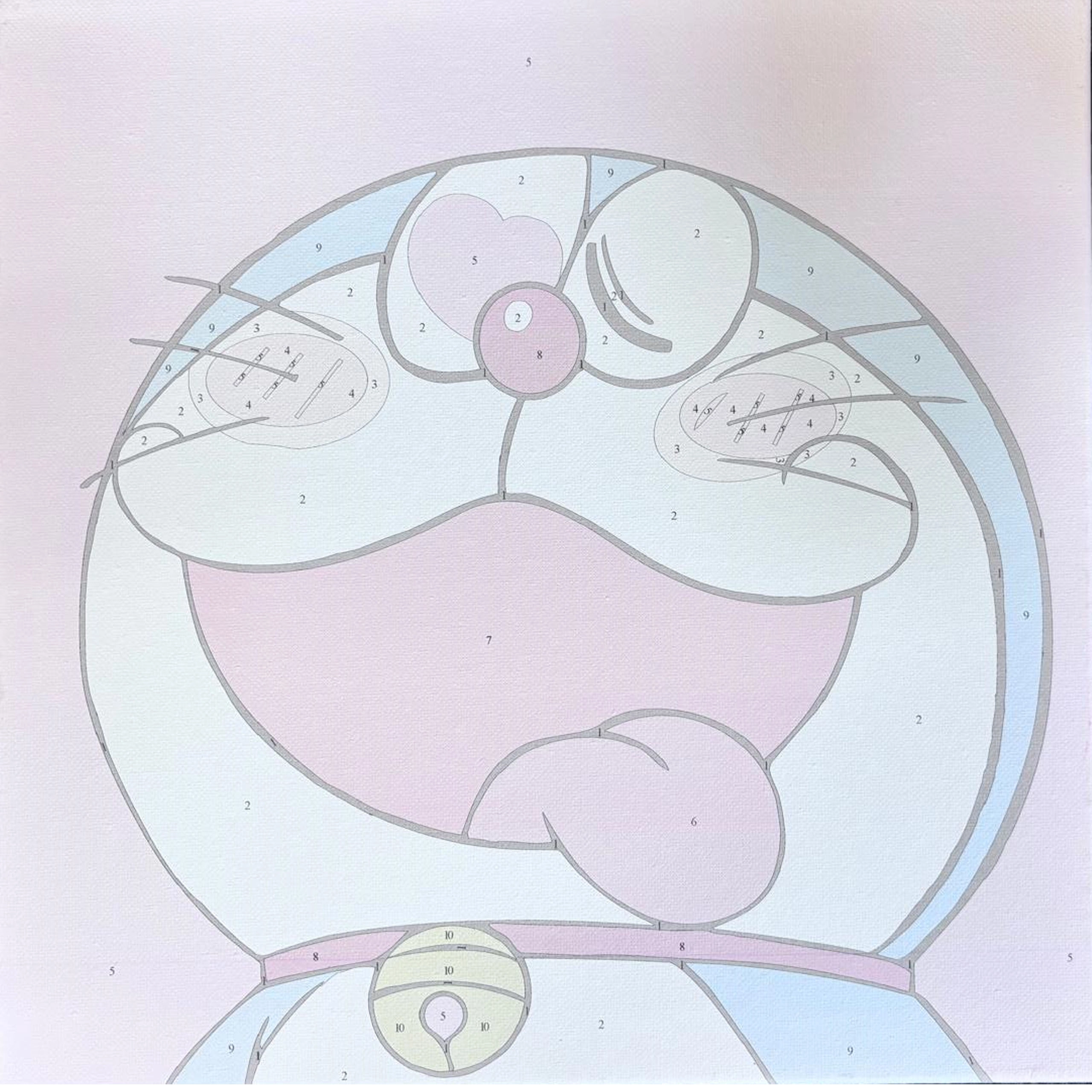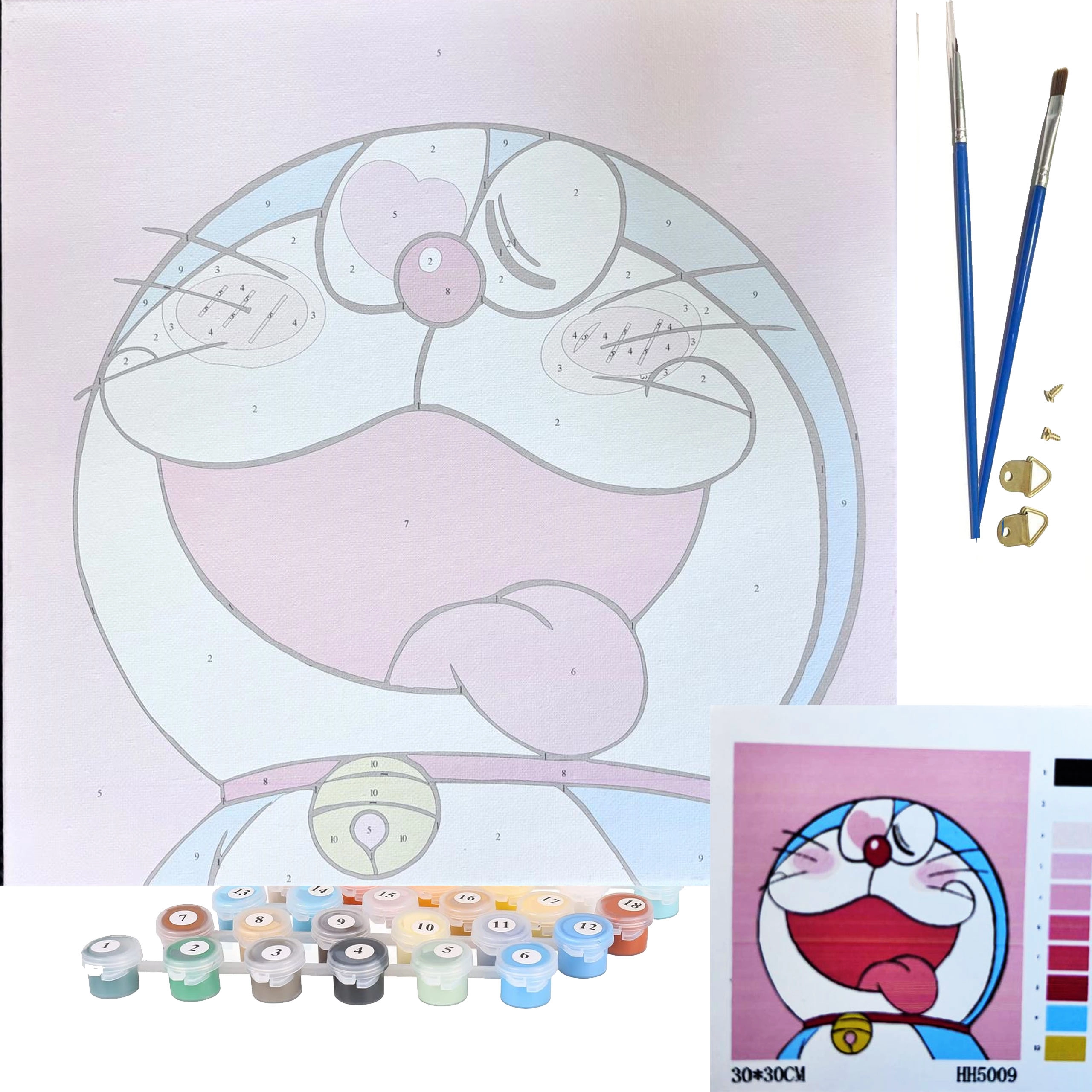 Toile avec numéros préimprimés, peintures acryliques, pinceaux, éléments de suspension