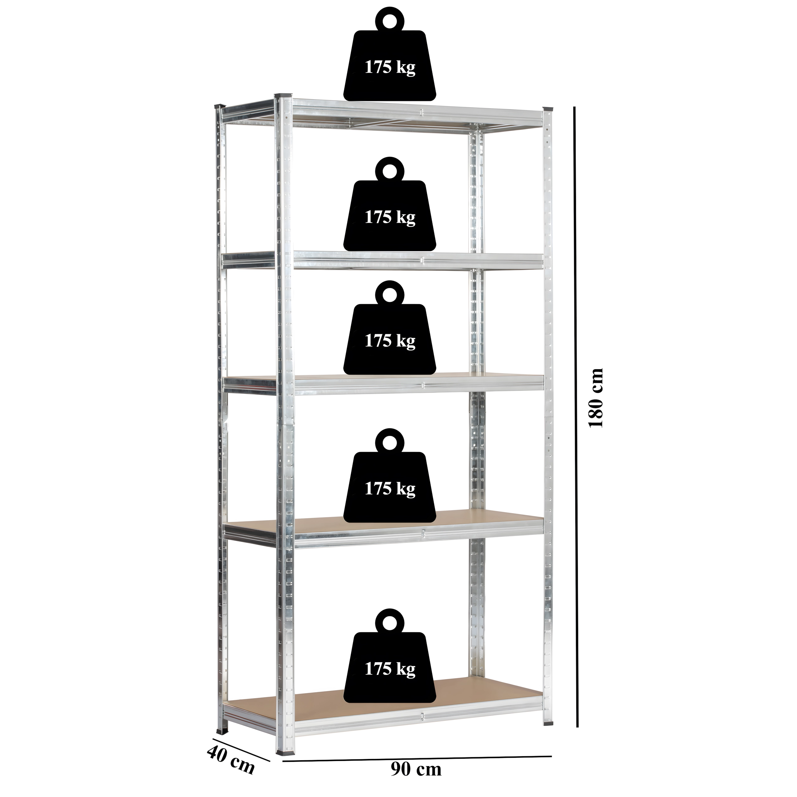 Étagère robuste en acier galvanisé offrant un stockage fiable et sécurisé pour outils, boîtes et matériaux. Grâce aux cinq tablettes réglables en hauteur en MDF, vous adaptez facilement l’espace à vos besoins et exploitez chaque centimètre efficacement.