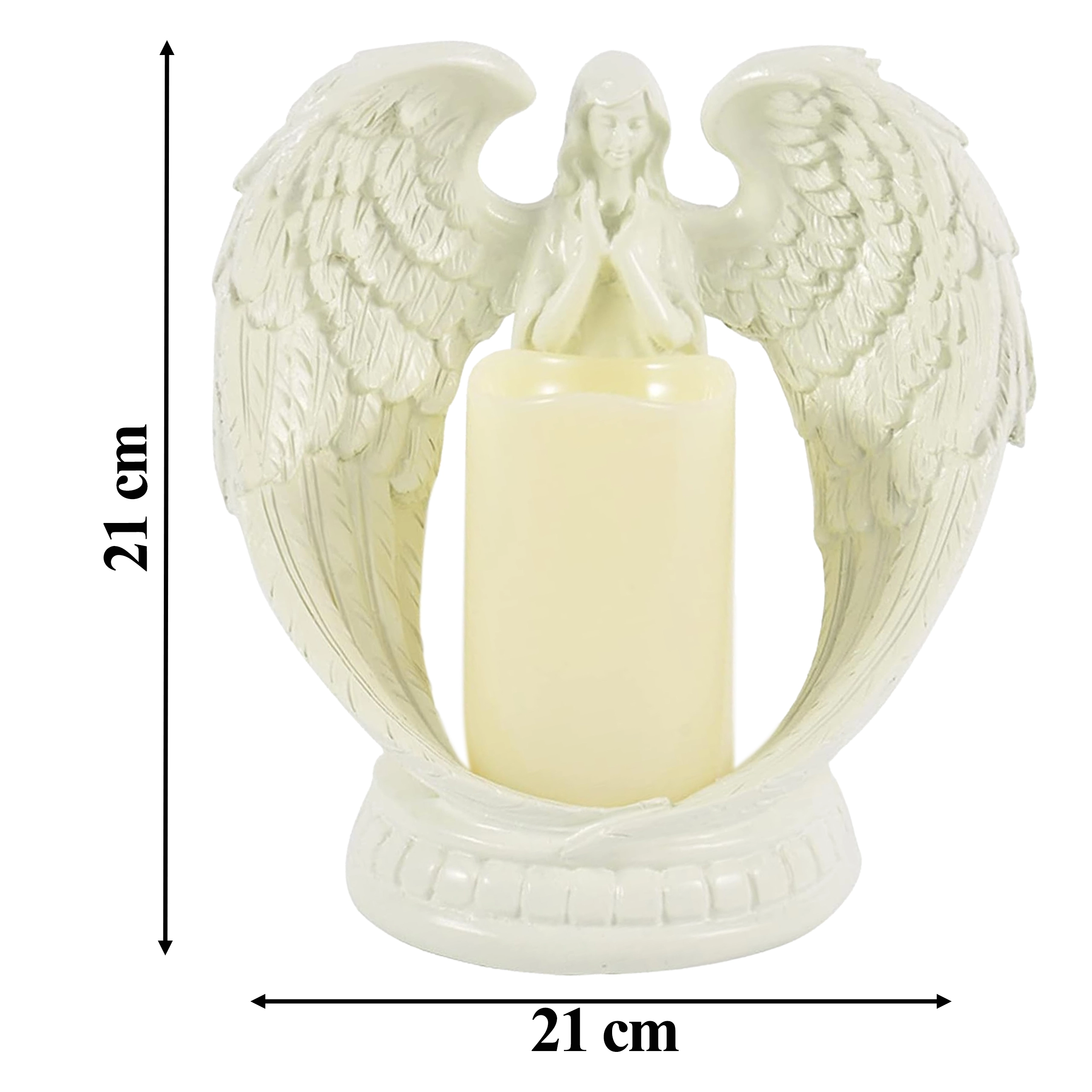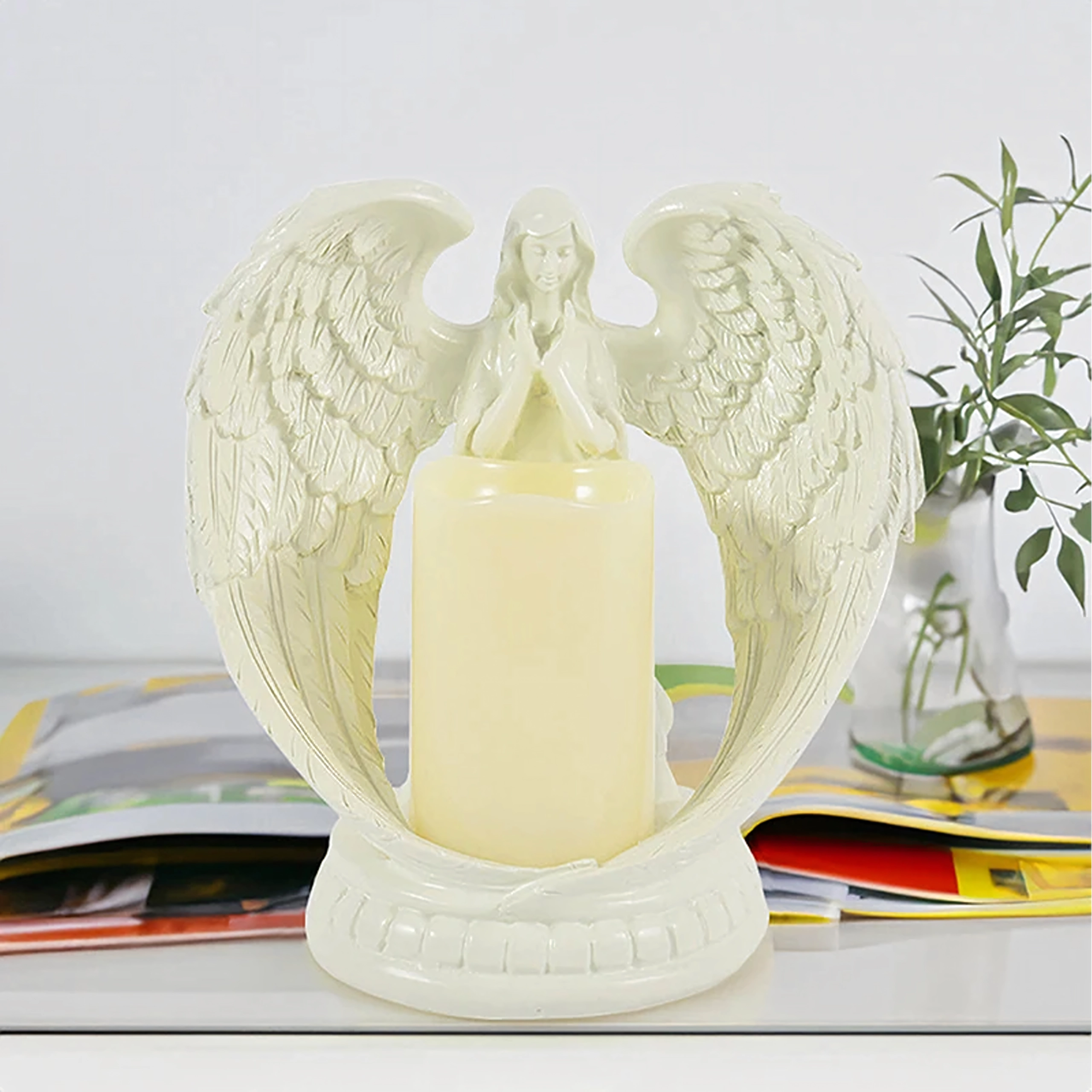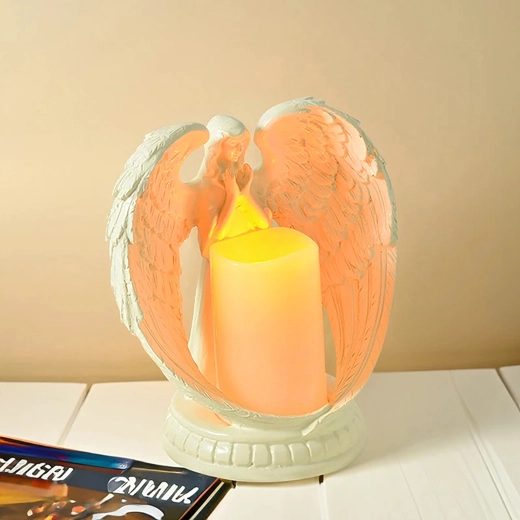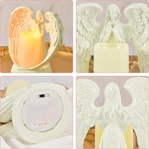 Ange décoratif élégant avec bougie à lumière LED réaliste. Fabriqué en résine polie, il symbolise la paix, le souvenir et la bénédiction. Idéal pour l’intérieur, les cérémonies religieuses, les sépultures et comme cadeau d’exception.